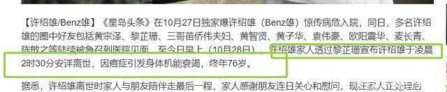 据许绍雄好友黎芷珊透露,他是因为癌症导致的多器官衰竭,至于后事处理,目前正在协商,稍后会向公众公开。