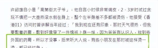 虽说背景不凡,但他也两度经历生死。 许绍雄生前接受港媒采访的时候,曾谈及到这方面。两三岁的时候也能为非调皮,所以将一大壶的热水倒在了身上,好在当时其父亲找到了一些认识的人,抹了外国的药膏,这次啊没有事情。